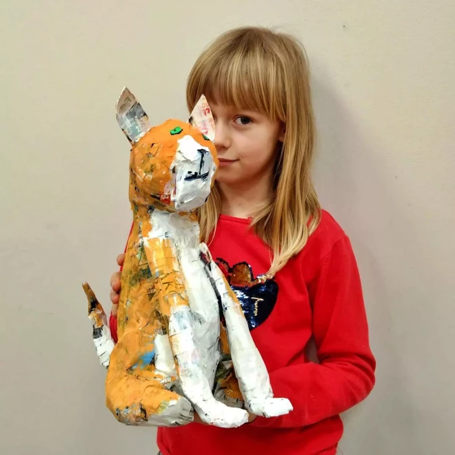 Zajęcia obejmują także tworzenie form przestrzennych z papier mâché, gipsu i drutu, co rozwija wyobraźnię przestrzenną, zdolności manualne oraz umiejętność pracy z materiałem w trójwymiarze.