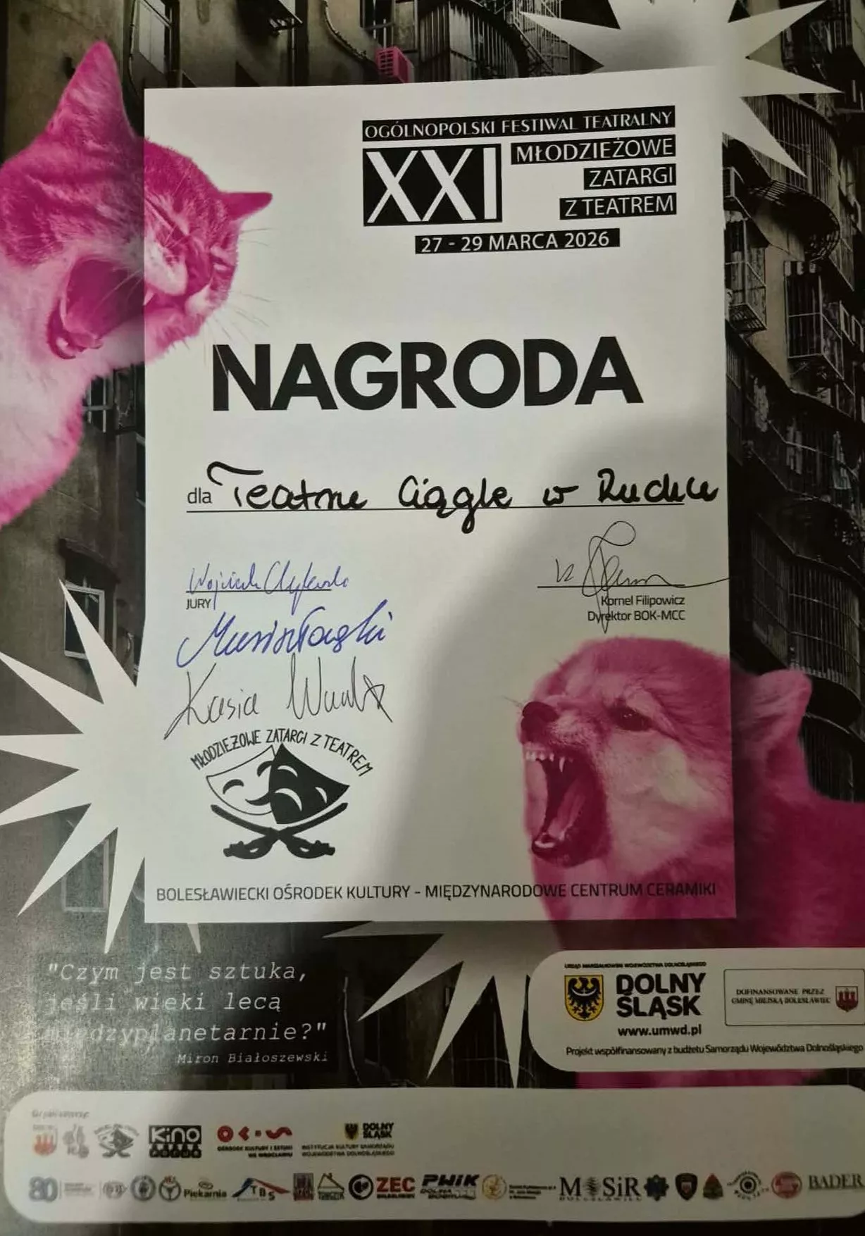 Znakomite wieści napłynęły z Bolesławieckiego Ośrodka Kultury – Międzynarodowego Centrum Ceramiki, gdzie w dniach 27–29 marca 2026 roku odbyła się XXI edycja Młodzieżowych Zatargów z Teatrem. Wśród nagrodzonych znalazł się Teatr Ciągle w Ruchu, który zdobył nagrodę za spektakl „Bańka” w choreografii Marty Muck.